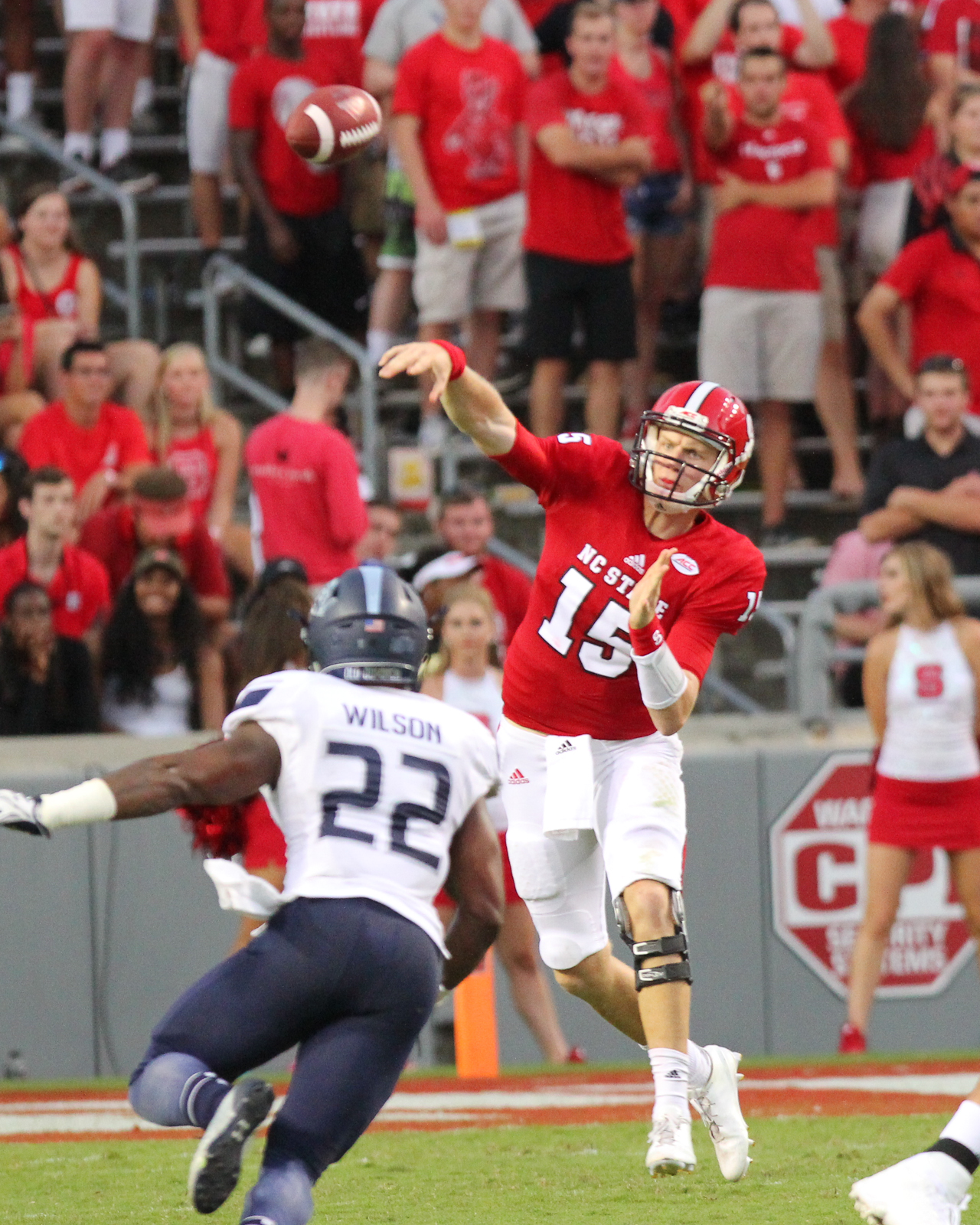 The quarterback tandem of Ryan Finley (24-28, 281 yards, 3 TD) and Jalan McClendon (3-4, 31 yards, 1 TD/2 carries, 4 yards, 2 TD) provided that as they combined for four touchdowns in the air, while McClendon rushed twice for scores to lead N.C. State to a 49-22 win at Carter Finley Stadium.
