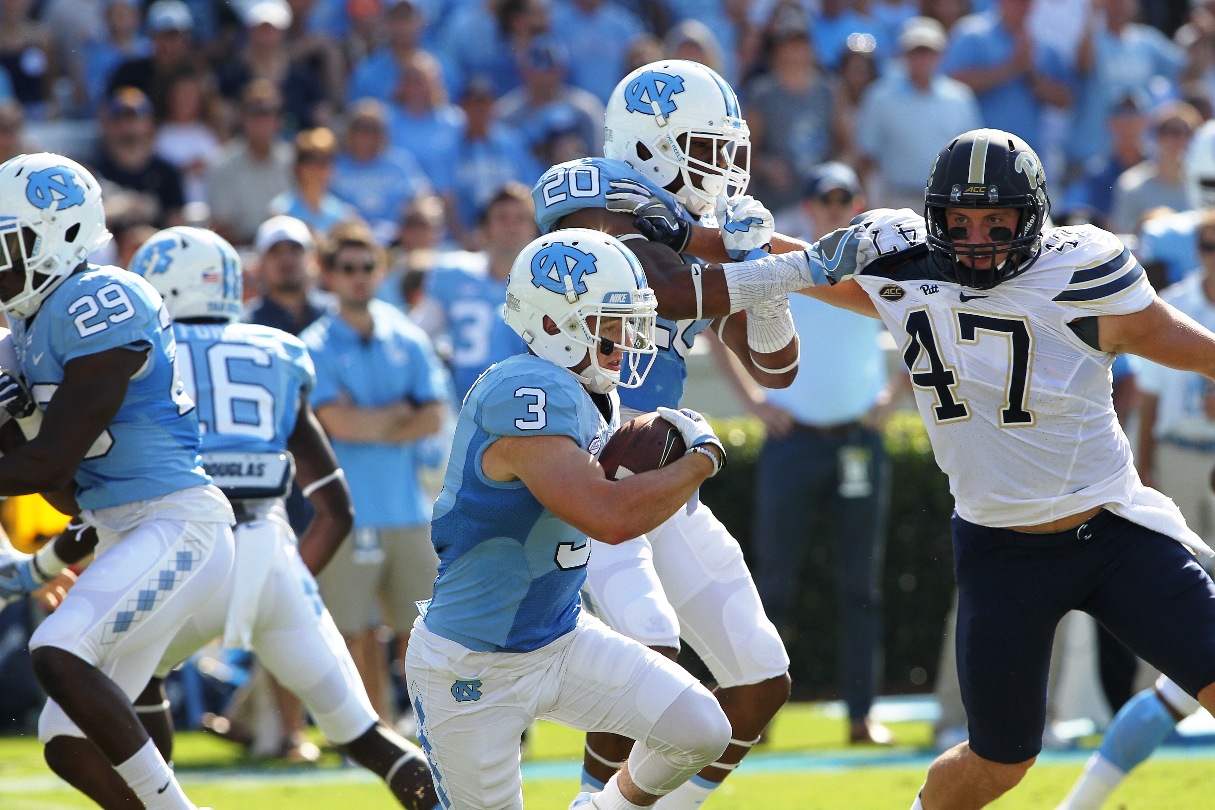 Though Pitt possessed the ball for 41 minutes, the Tar Heels defense led by a career performance from cornerback M.J. Stewart who made 13 tackles, including 10 solo hits, held the Panthers offense in check during the final quarter.