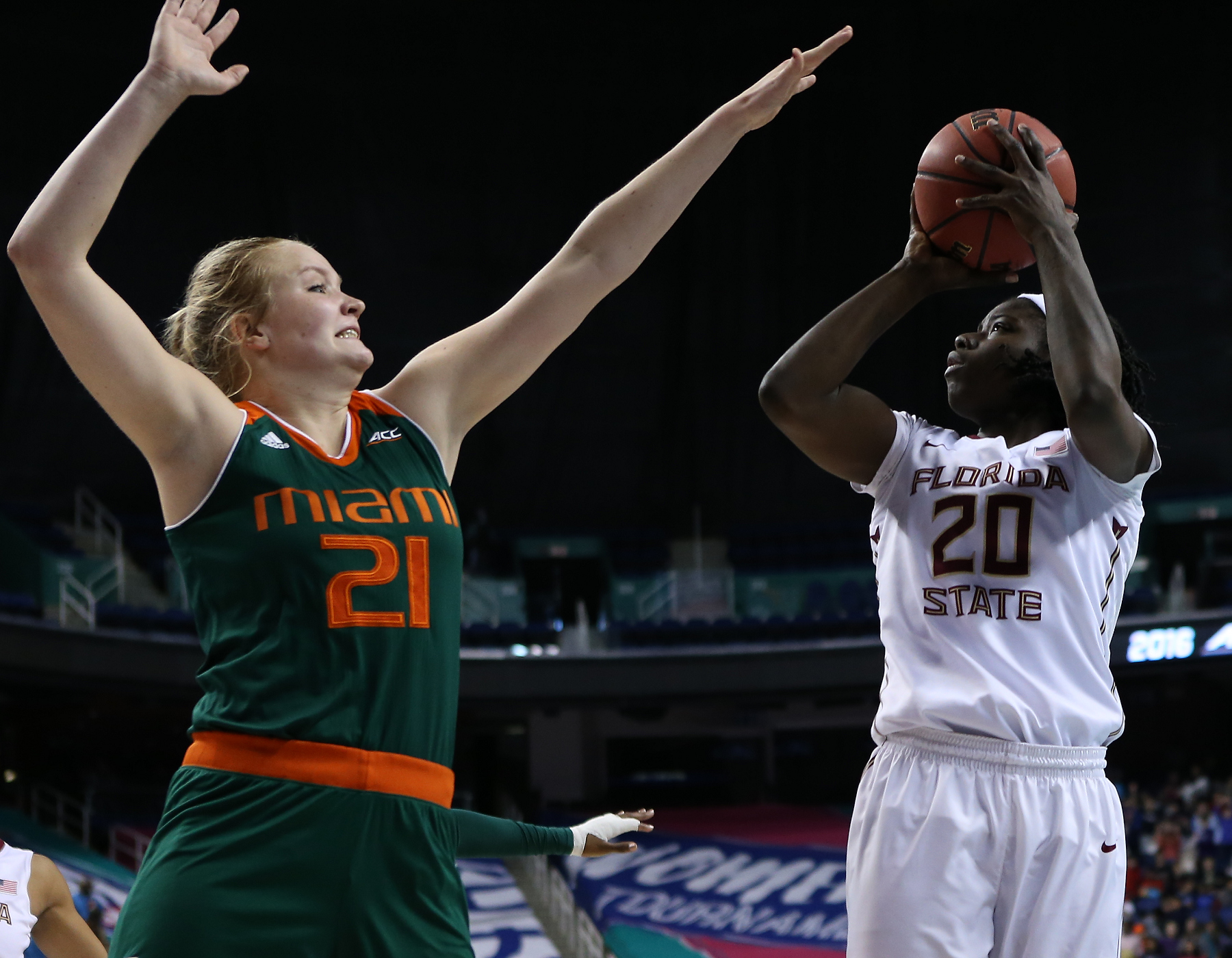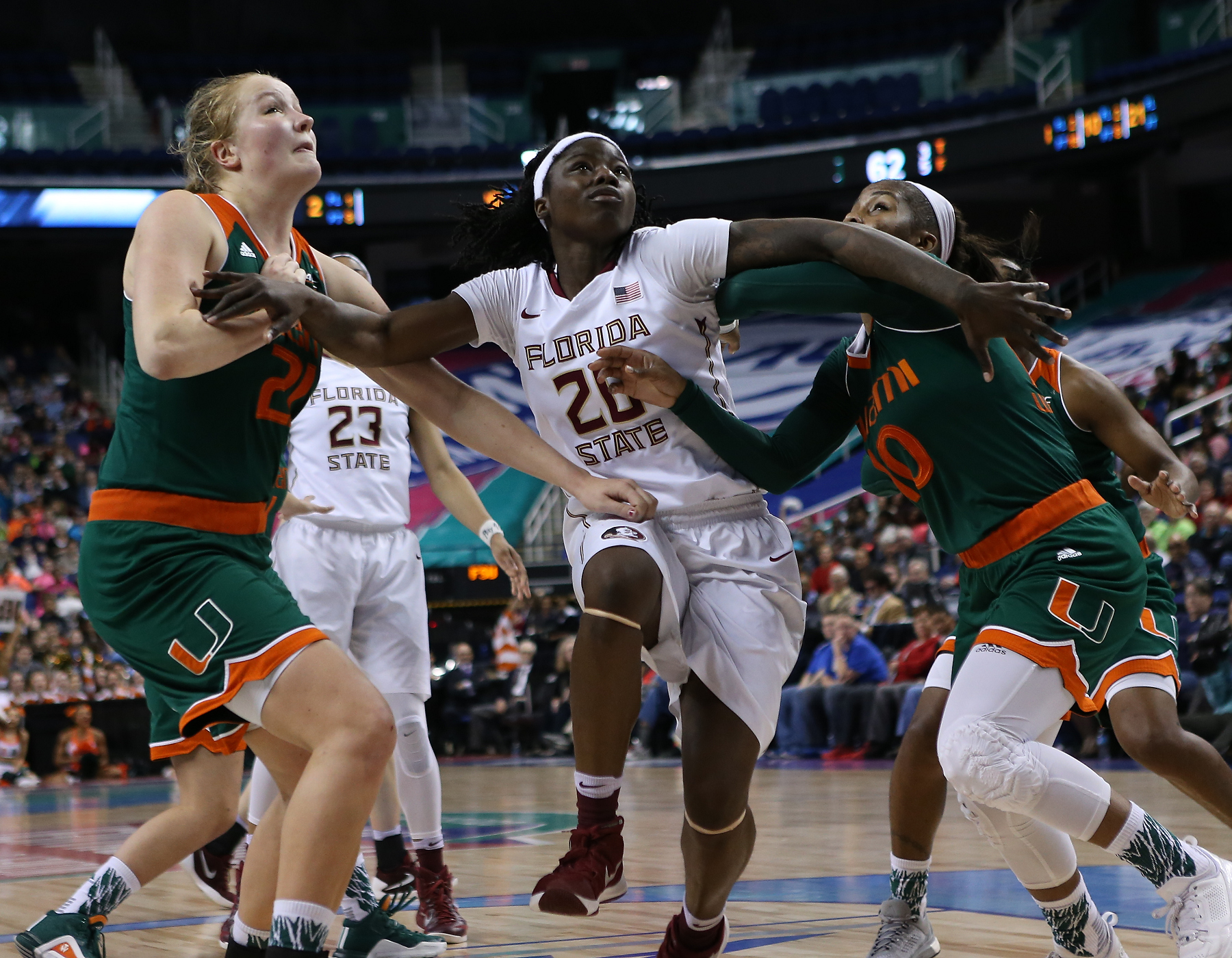 Tied at 37 apiece at halftime, the fifth-seeded Miami Hurricanes (24-7) took over for the final 20 minutes of play and topped fourth-seeded Florida State (23-7) by a score of 74-56 and advanced to the semifinals to face two-time defending tournament champion Notre Dame on Friday.