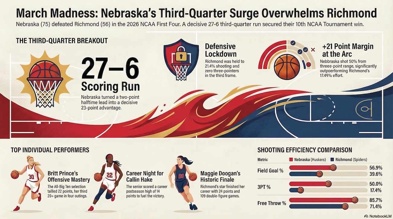 The Huskers shot a dominating 56.9% from the floor, including 50% from the three-point line, while outscoring Richmond by 21 points at the arc.