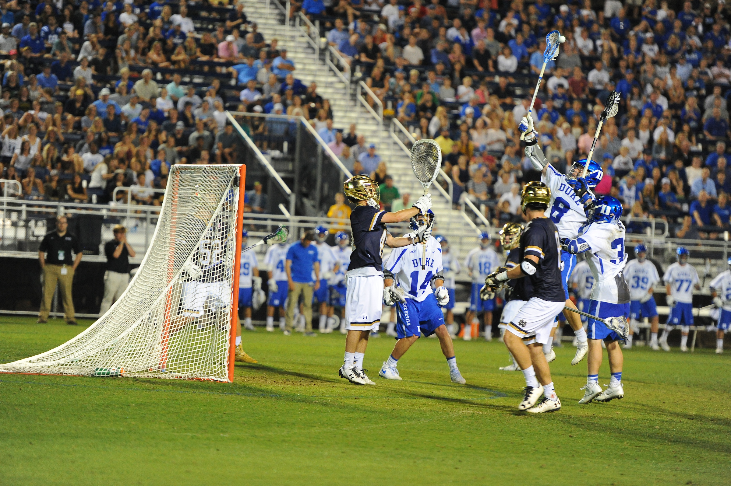 After goalkeeper Shane Doss made his most critical save of 10 total in the dying seconds of regulation time, Notre Dame preserved a 7-6 win over the third-ranked and tournament host Duke Blue Devils (11-4).