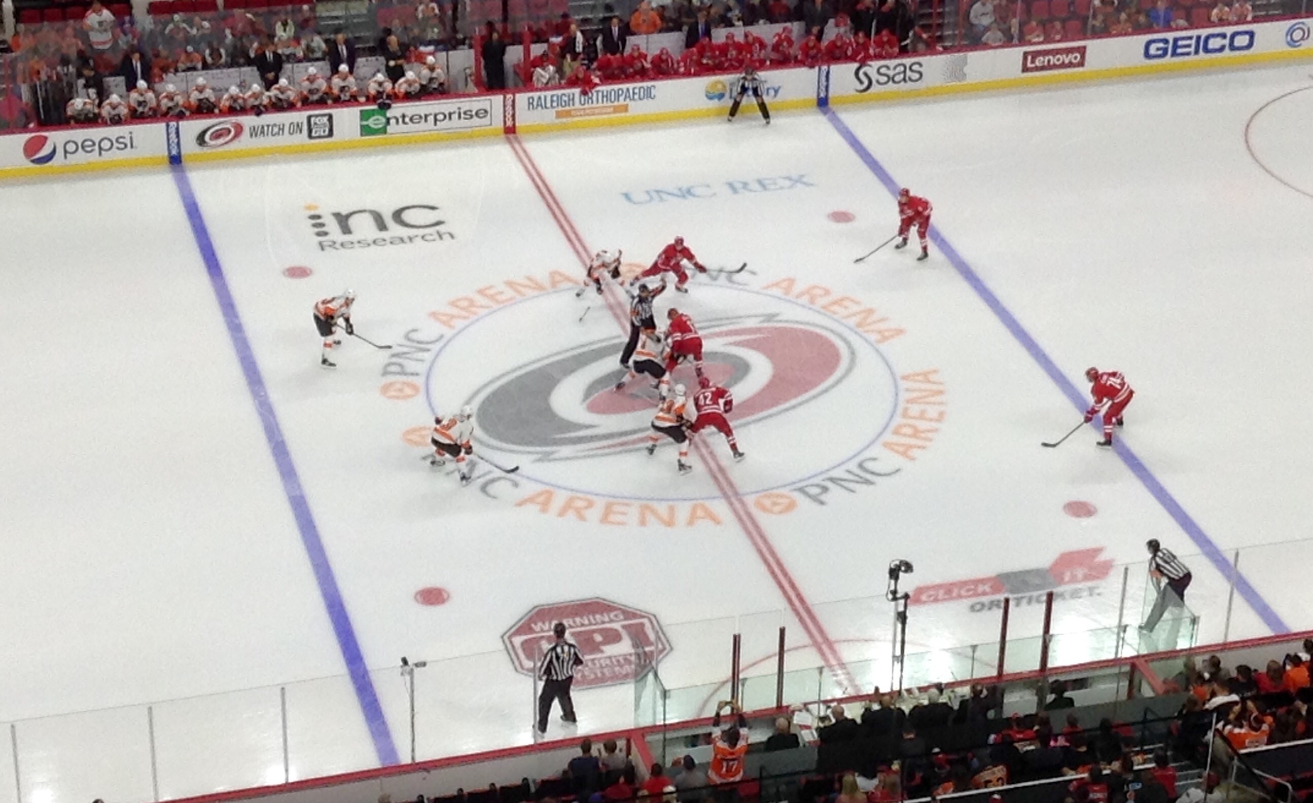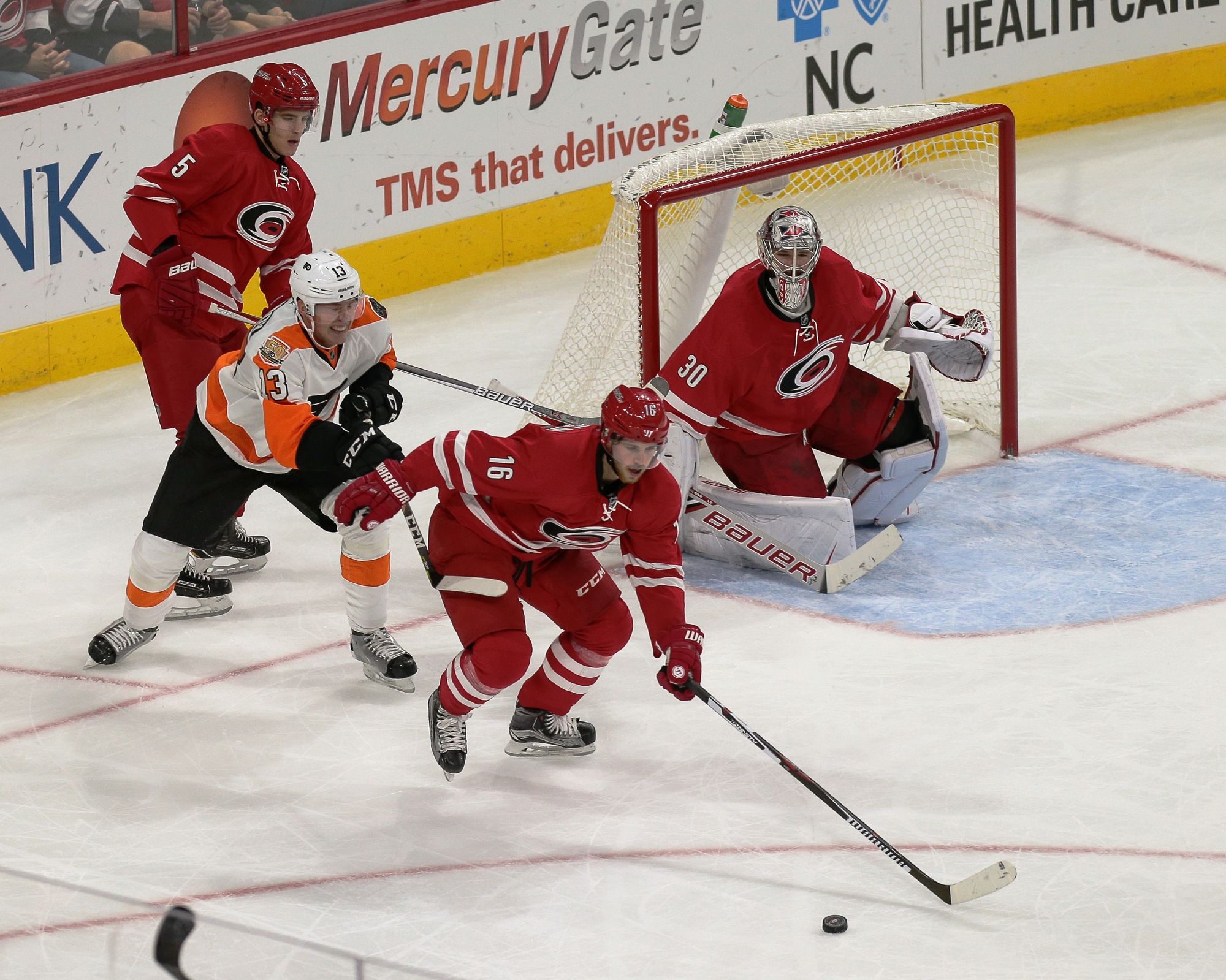 A missed Carolina pass in the neutral zone came to Giroux who quickly dumped it into the Hurricanes zone.