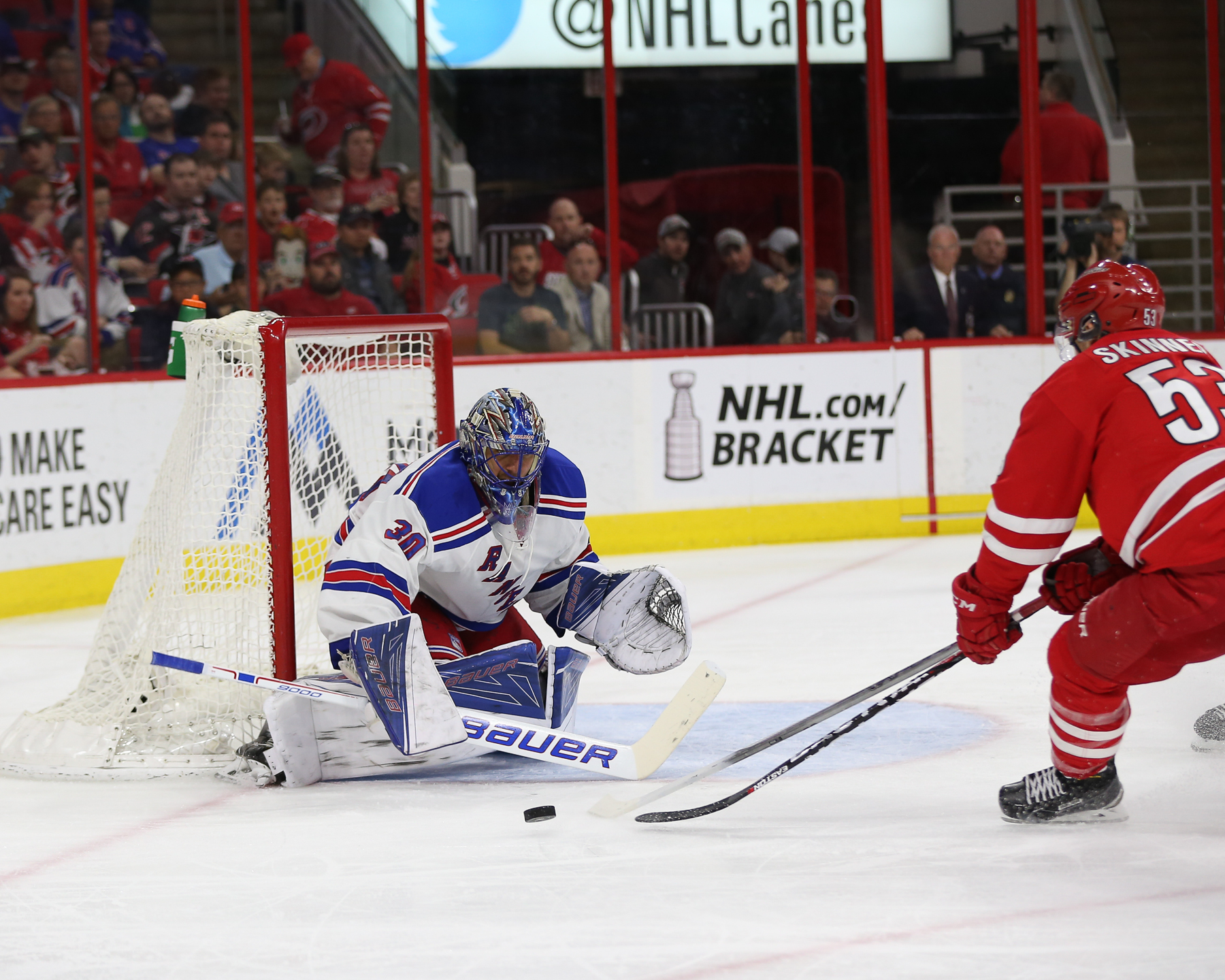 Carolina outshot New York 7-0 during the first five minutes of play, but couldn’t beat goaltender Henrik Lundqvist who finished the night making 24 stops in the loss.
