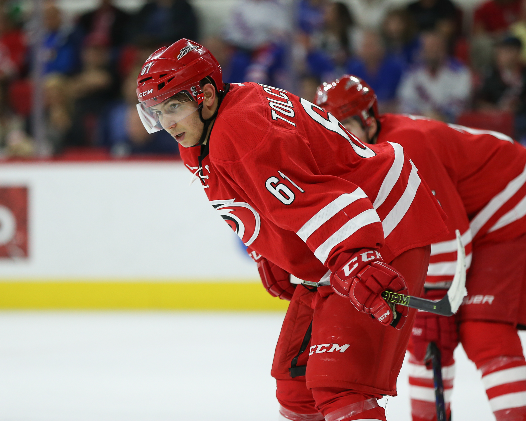 After picking the puck up from defenseman Ryan Murphy, rookie forward Sergey Tolchinsky carried the puck across the high slot before dropping it back to Faulk at the right point.
