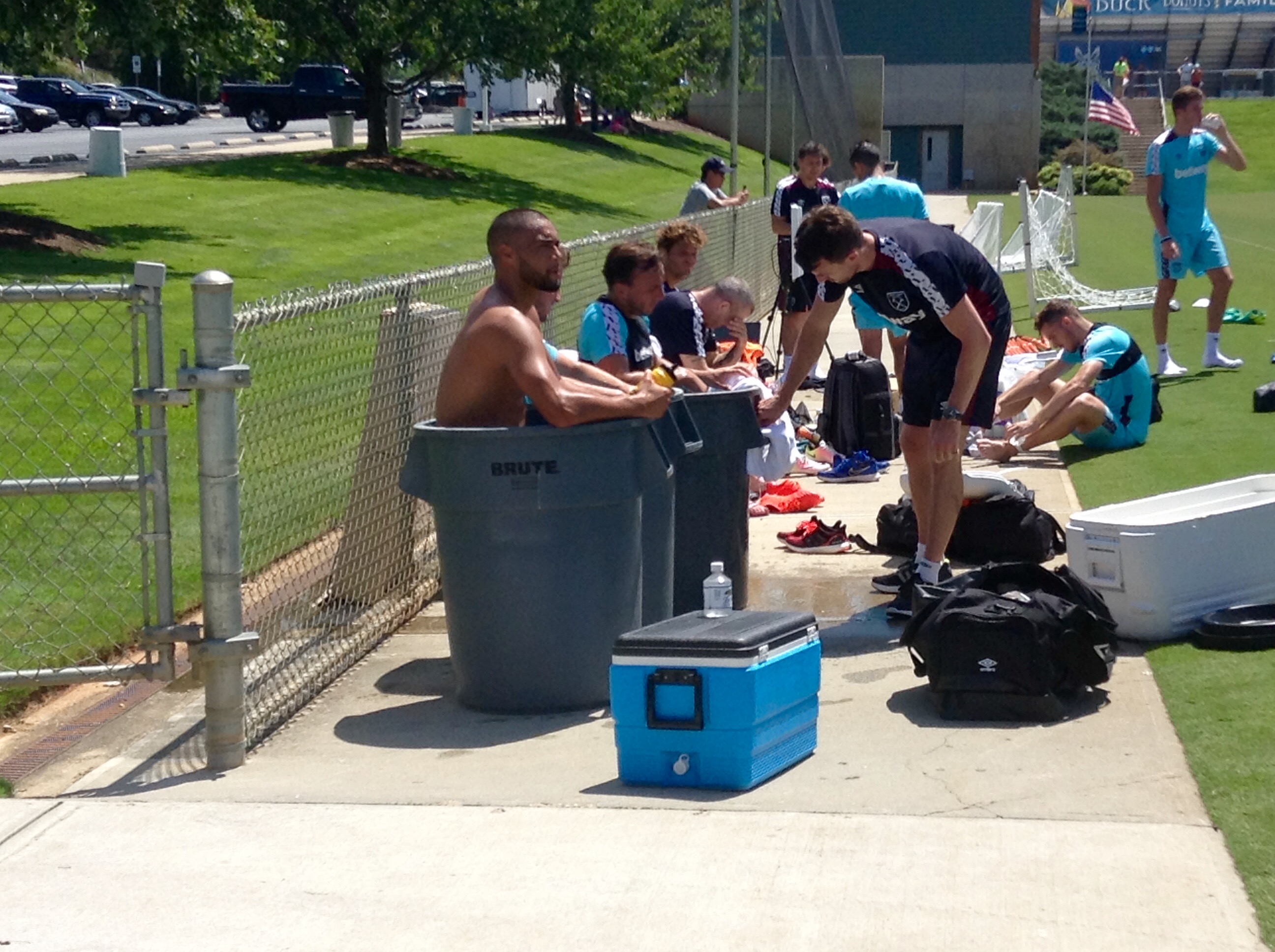 Though weather conditions in the Pacific Northwest mimicked those of back home, the North Carolina heat and humidity following practice required the Hammers training staff to improvise with coolers of ice poured into rubber garbage pails as makeshift recovery ice baths for the players to immerse themselves in.