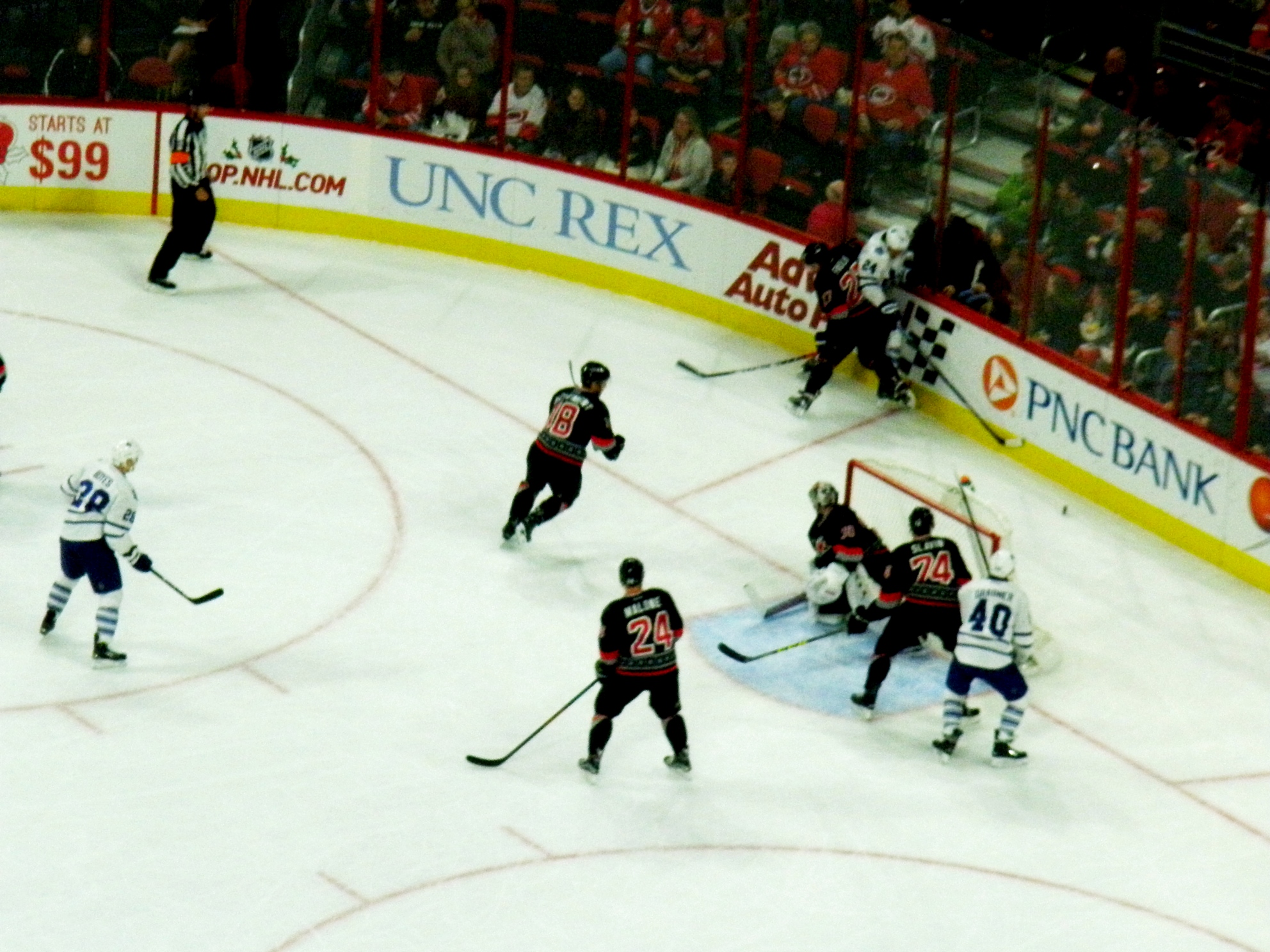 Following a pad save by Ward, a scrum ensued as Matthias tried to wack at the puck, but was quickly shoved away by Carolina rookie defenseman Brett Pesce.