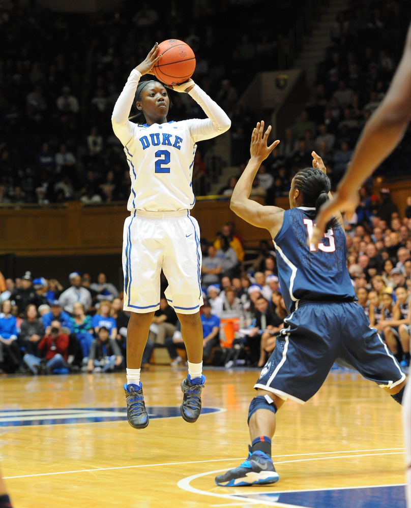 While trying to contain Stewart, Duke countered by spreading around its offense as Chelsea Gray (7 points), Elizabeth Williams (5 points), and Haley Peters worked to keep pace with the Huskies.