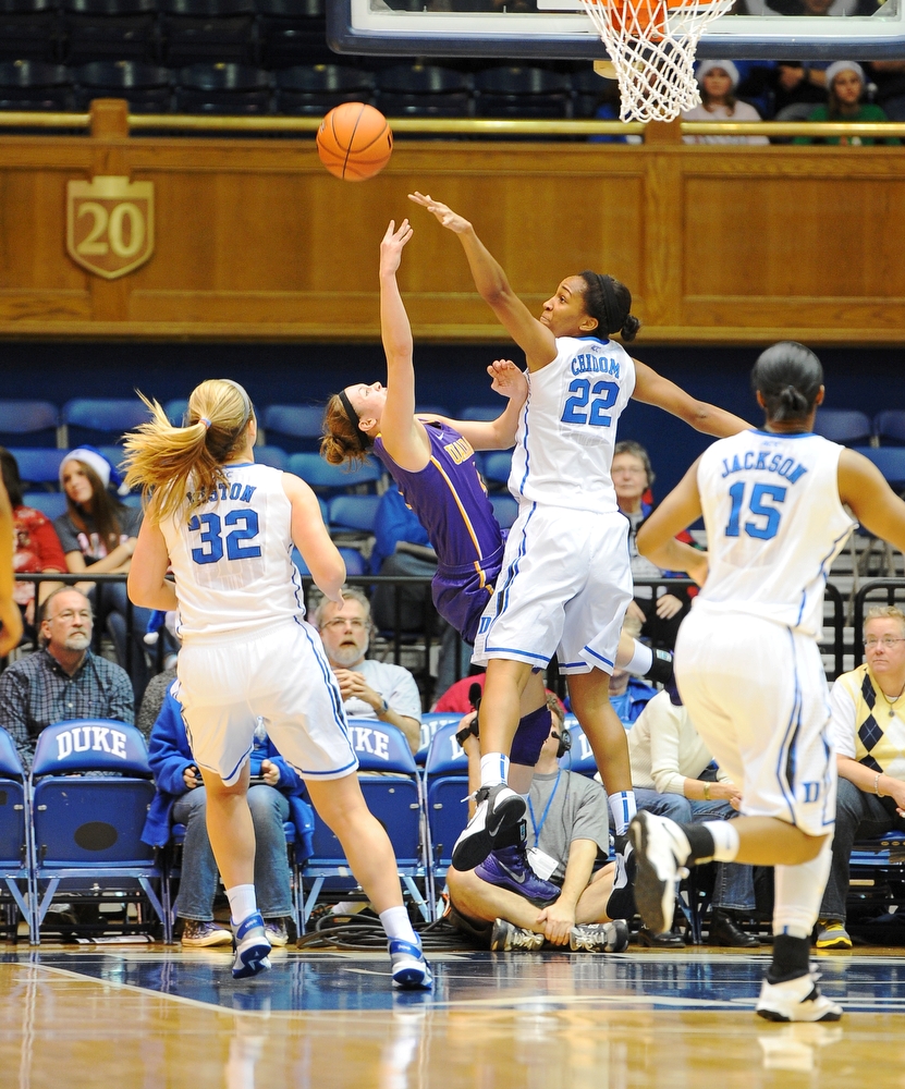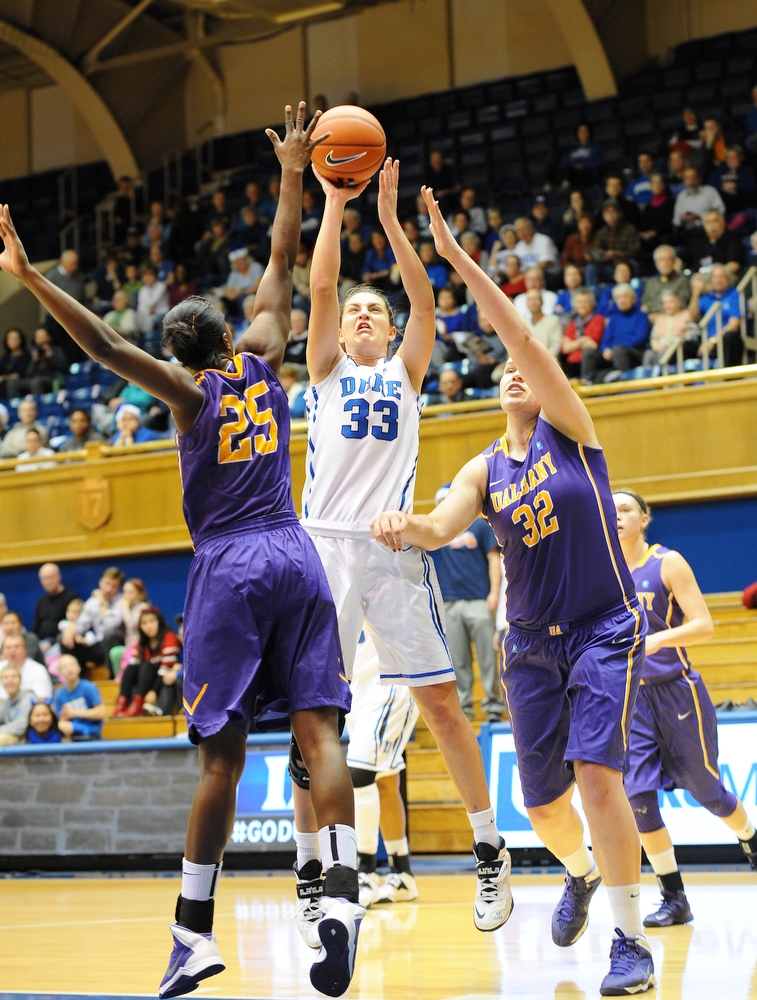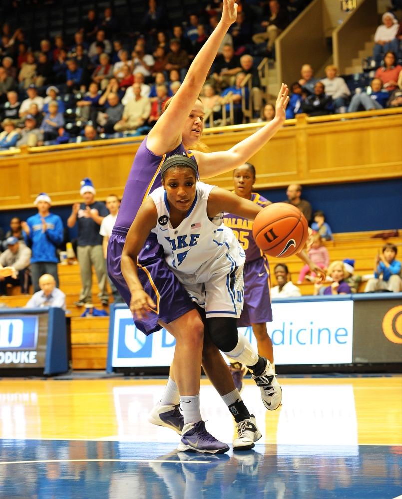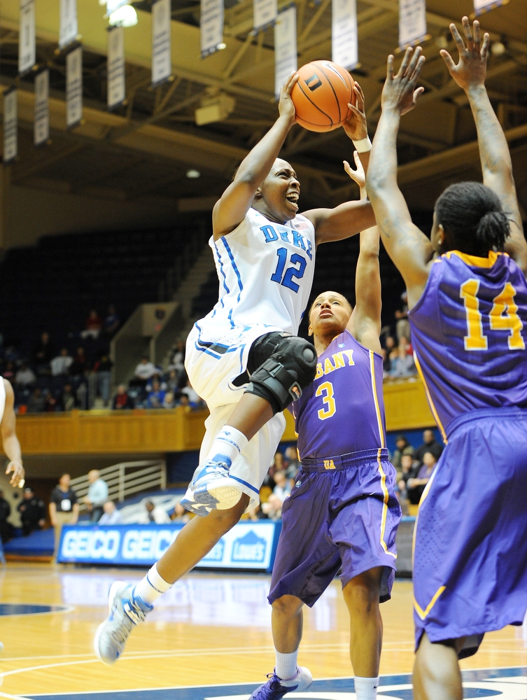 Haley Peters (17 points , 4 rebounds), Chelsea Gray (12 points, 9 assists, 6 steals), Richa Jackson (12 points, 4 rebounds), and Elizabeth Williams (9 points, 4 rebounds) led the Blue Devils’ scoring that had to offset and overpower a game-high 24-point performance from Albany’s Shereesha Richards.