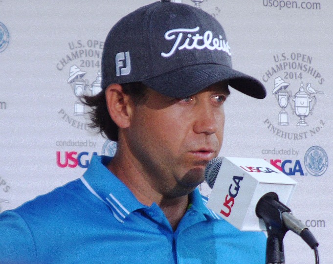 He had an unplayable lie as his ball lay in a deep stack of pine needles and took a drop and penalty stroke on the fourth hole after his drive went offline into the waste area along the fairway.