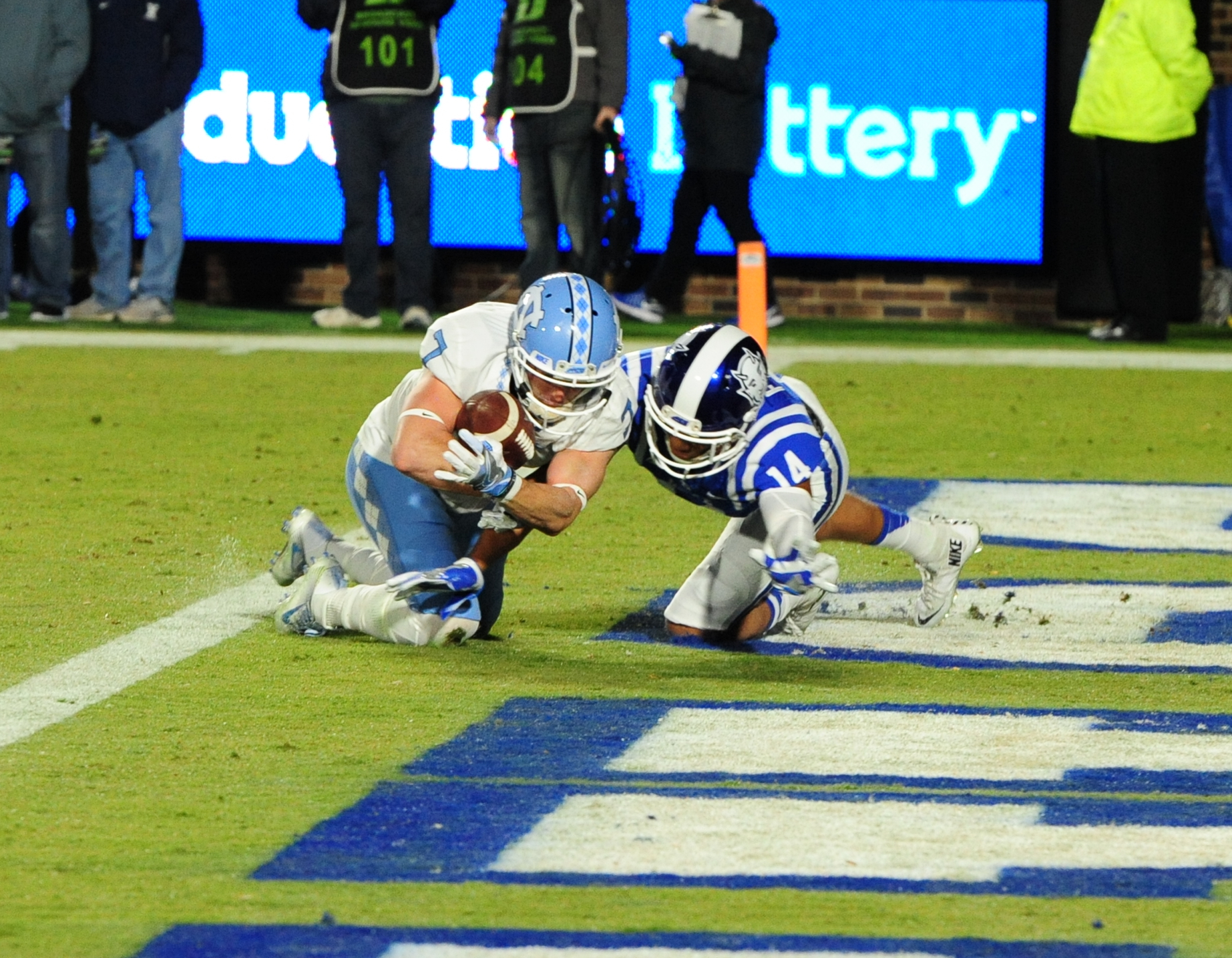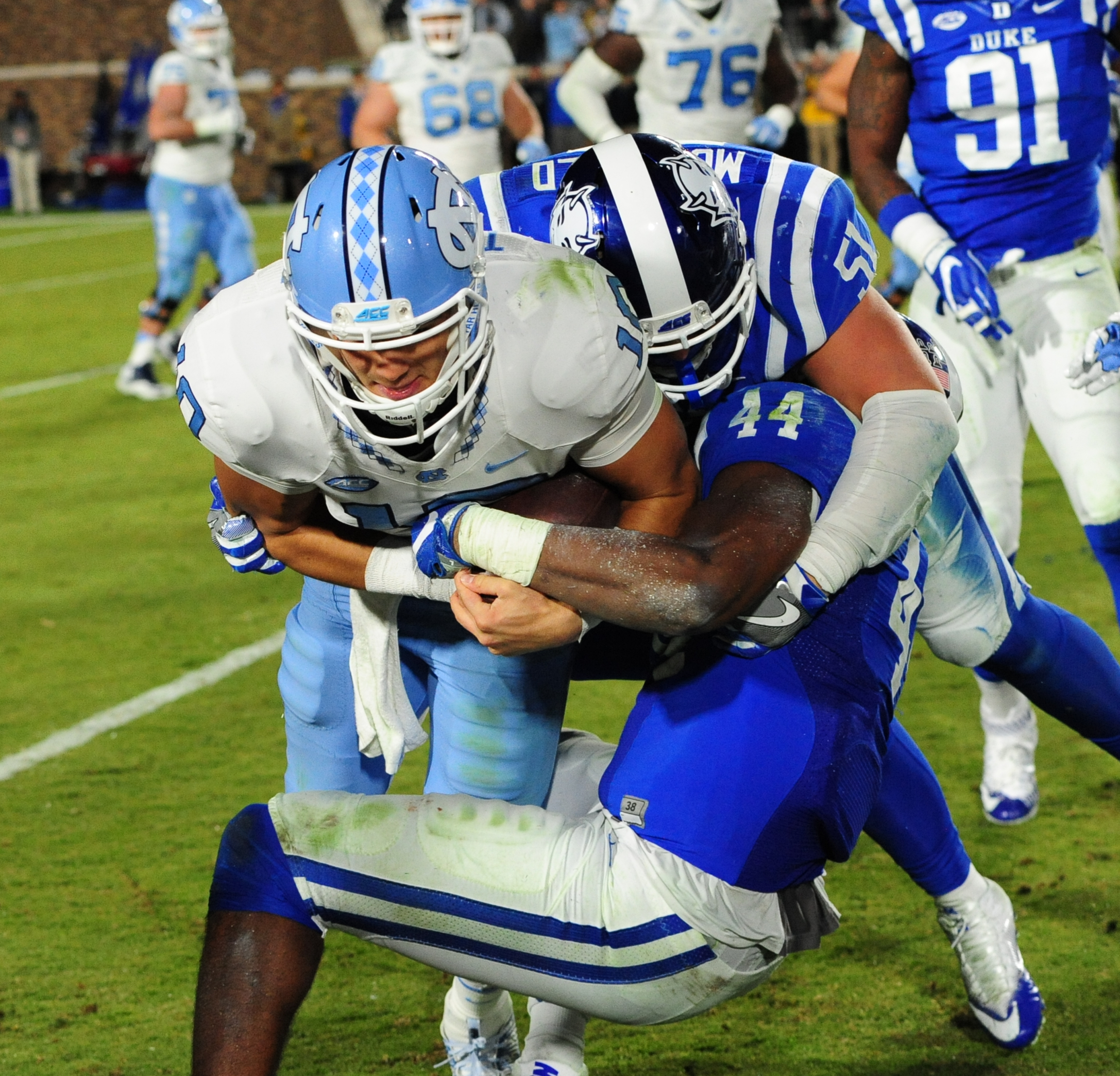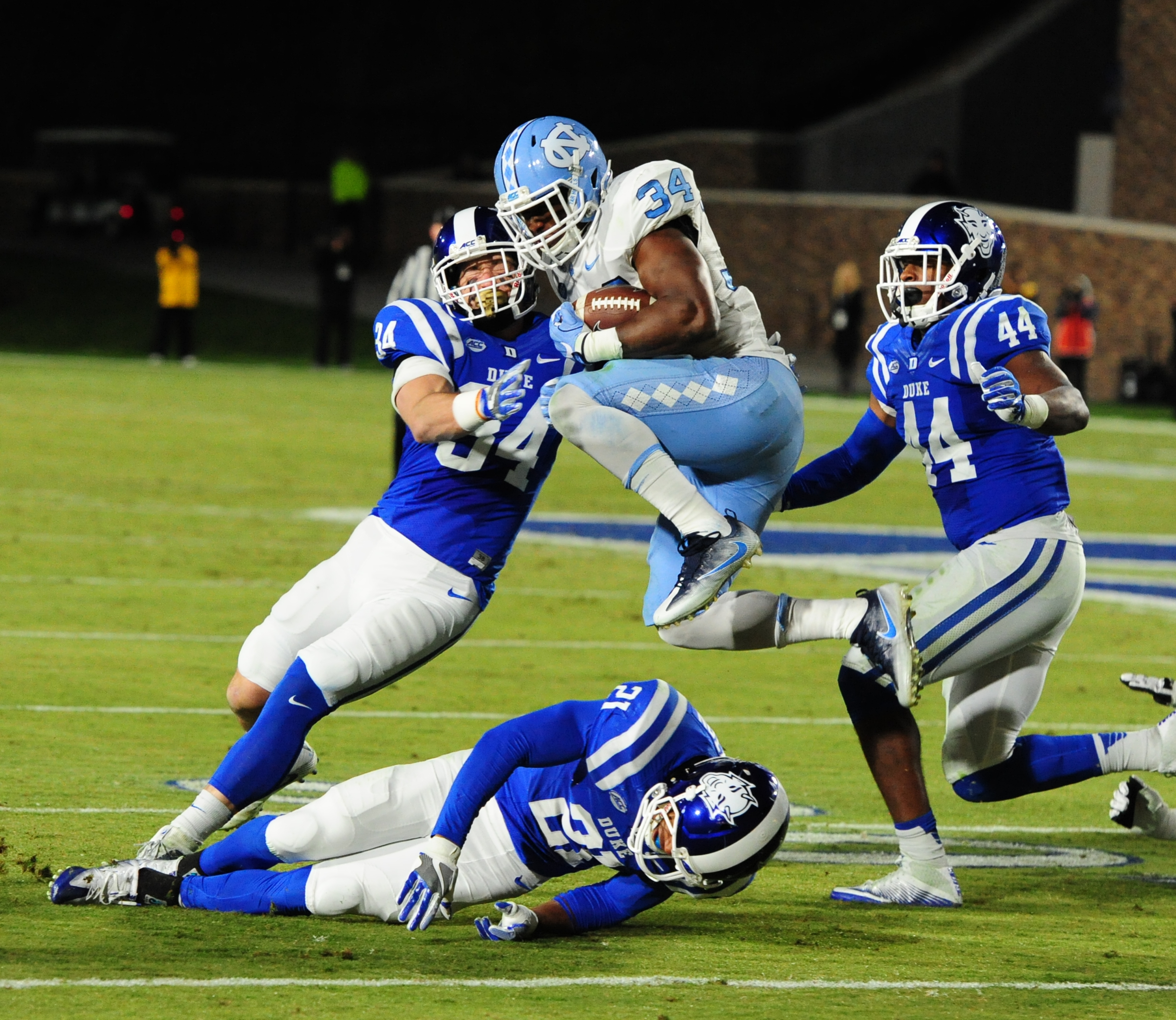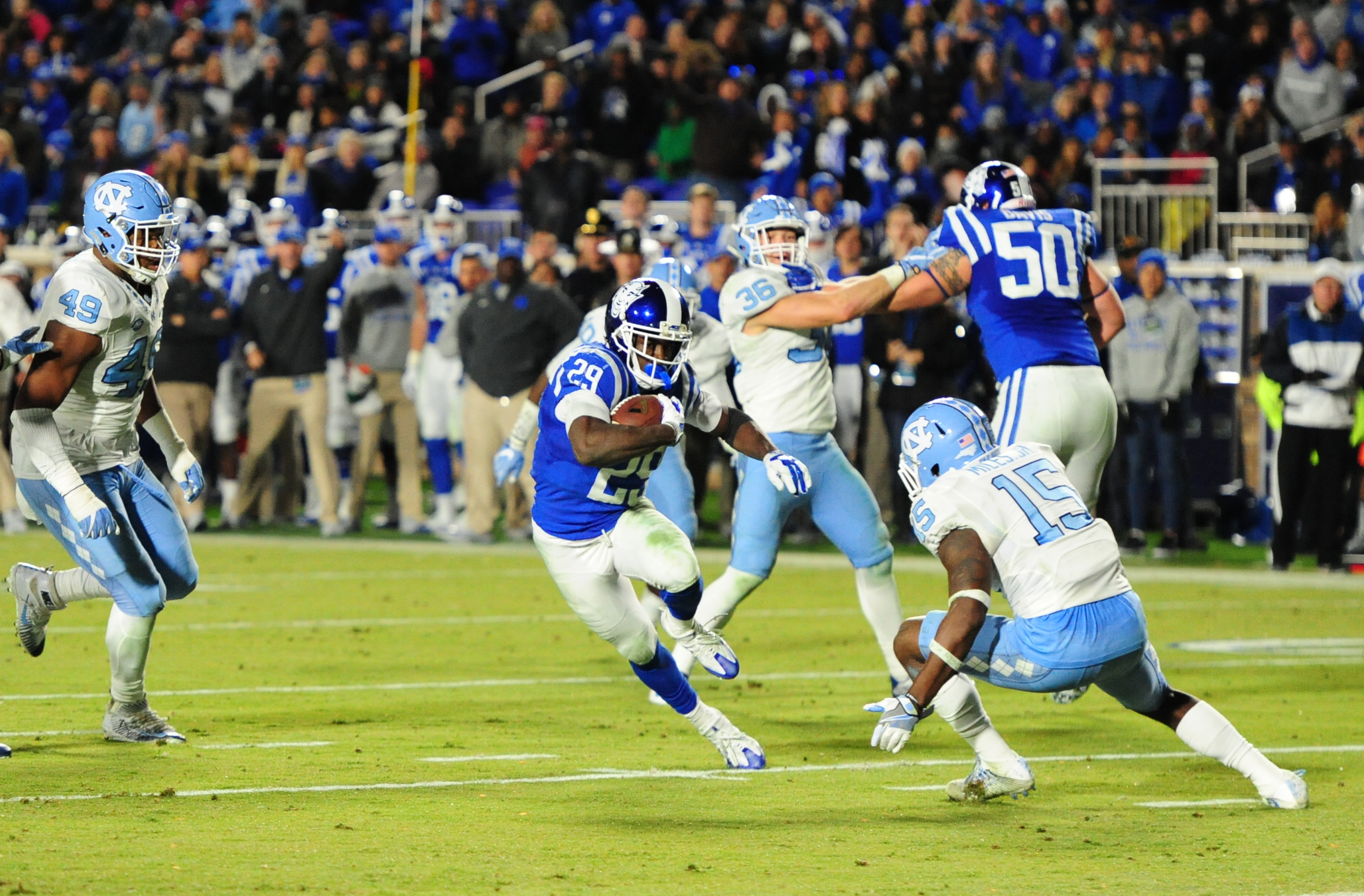 UNC led 14-0 after the first quarter of play before Duke evened it up with touchdowns from Jones and Wilson.