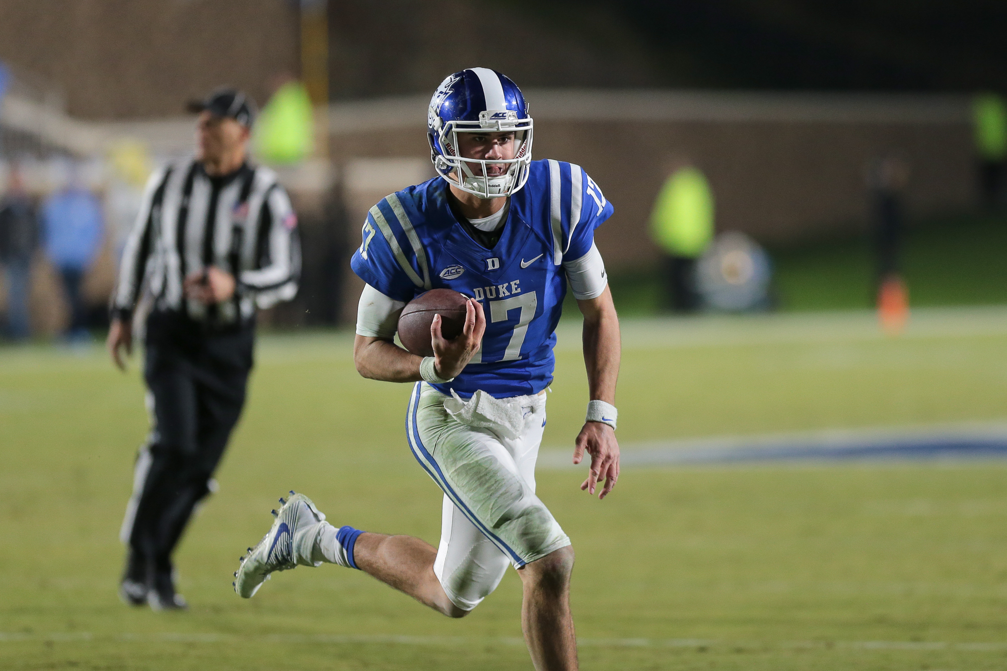 Duke redshirt freshman quarterback Daniel Jones threw for 240 yards, rushed for 94, and was responsible for three touchdowns – two off the rush and one in the air.