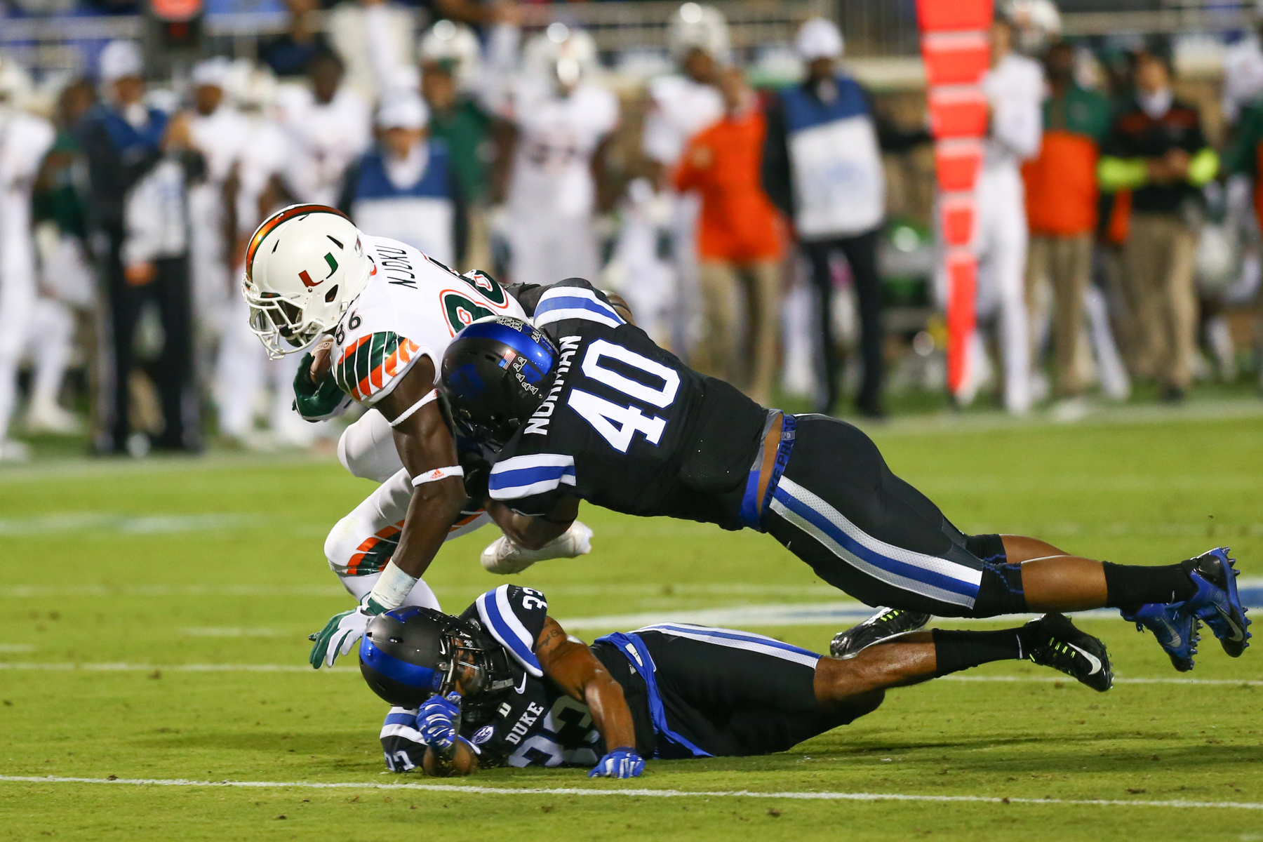 During the Hurricanes’ opening kick return, Duke’s Alonzo Saxton II laid a chest-level hit on Mark Walton that stopped him cold and knocked the ball loose from his grasp.