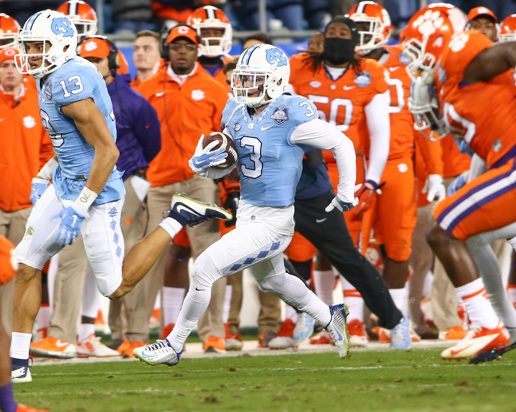 For the Tar Heels, Marquise Williams broke his own single-season UNC record for rushing yards by a quarterback, now sitting at 867 yards, and completed 11 passes for 224 yards, averaging 20.4 yards per completion.