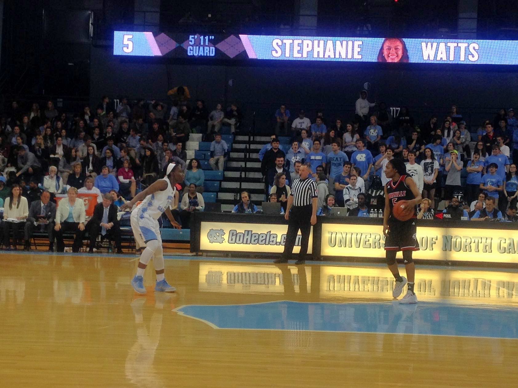 Stephanie Watts (16 points, 7 rebounds), Hillary Summers (14 points, 10 point), and Destinee Walker (12 points, 3 rebounds) led the Tar Heels (12-12, 2-7) while N’Dea Bryant’s work on the boards (6 points, 6 rebounds) supported Summers’ effort in that area to keep pace with Louisville (18-5, 10-0) early on.