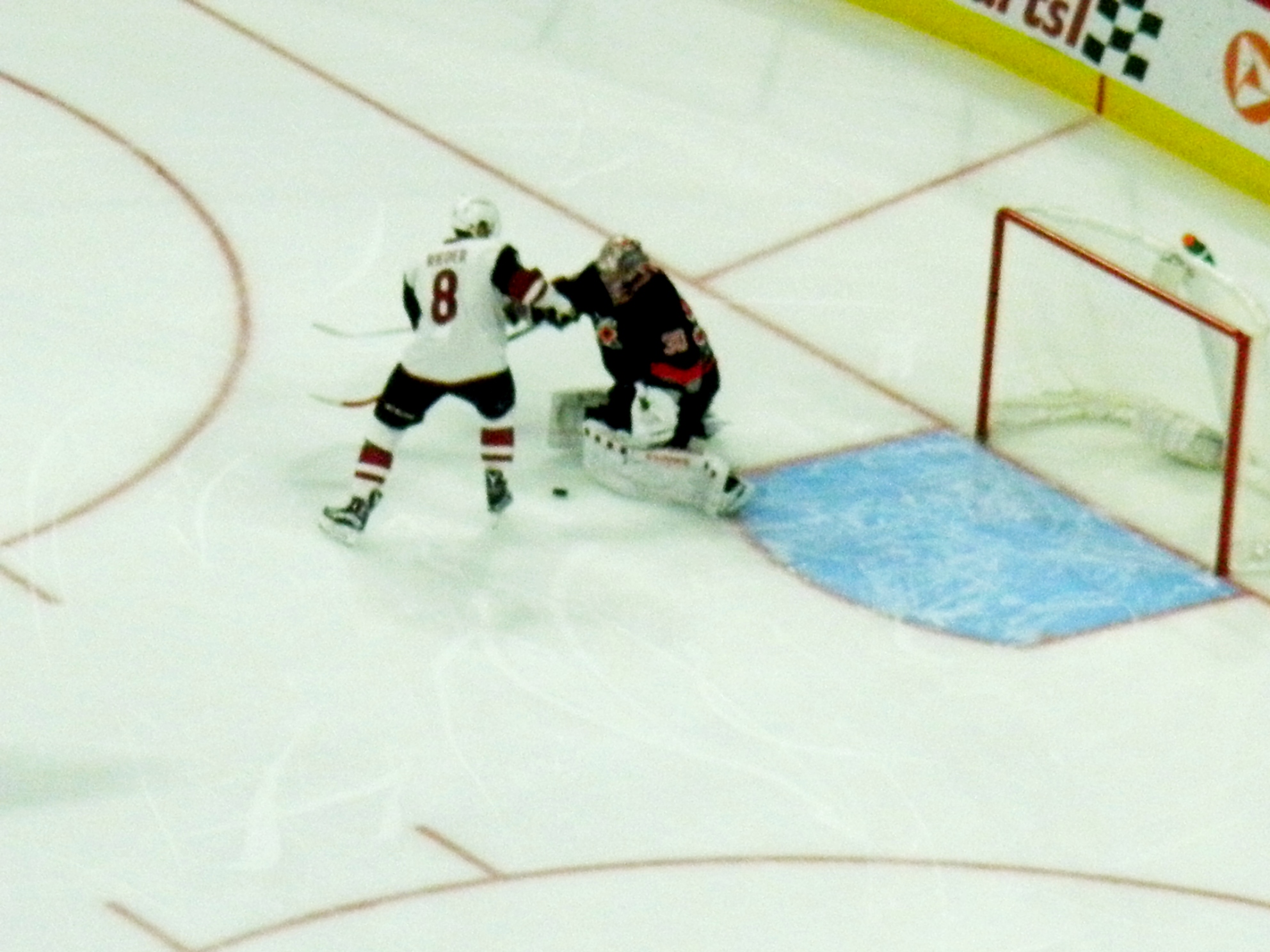 Pinching in on a cross-crease attempt at beating Ward from Brad Richardson, defenseman Niklas Grossman got the puck at the right faceoff dot and threaded a shot into the net, and put Arizona ahead 2-1 with 3:05 to play in the period.