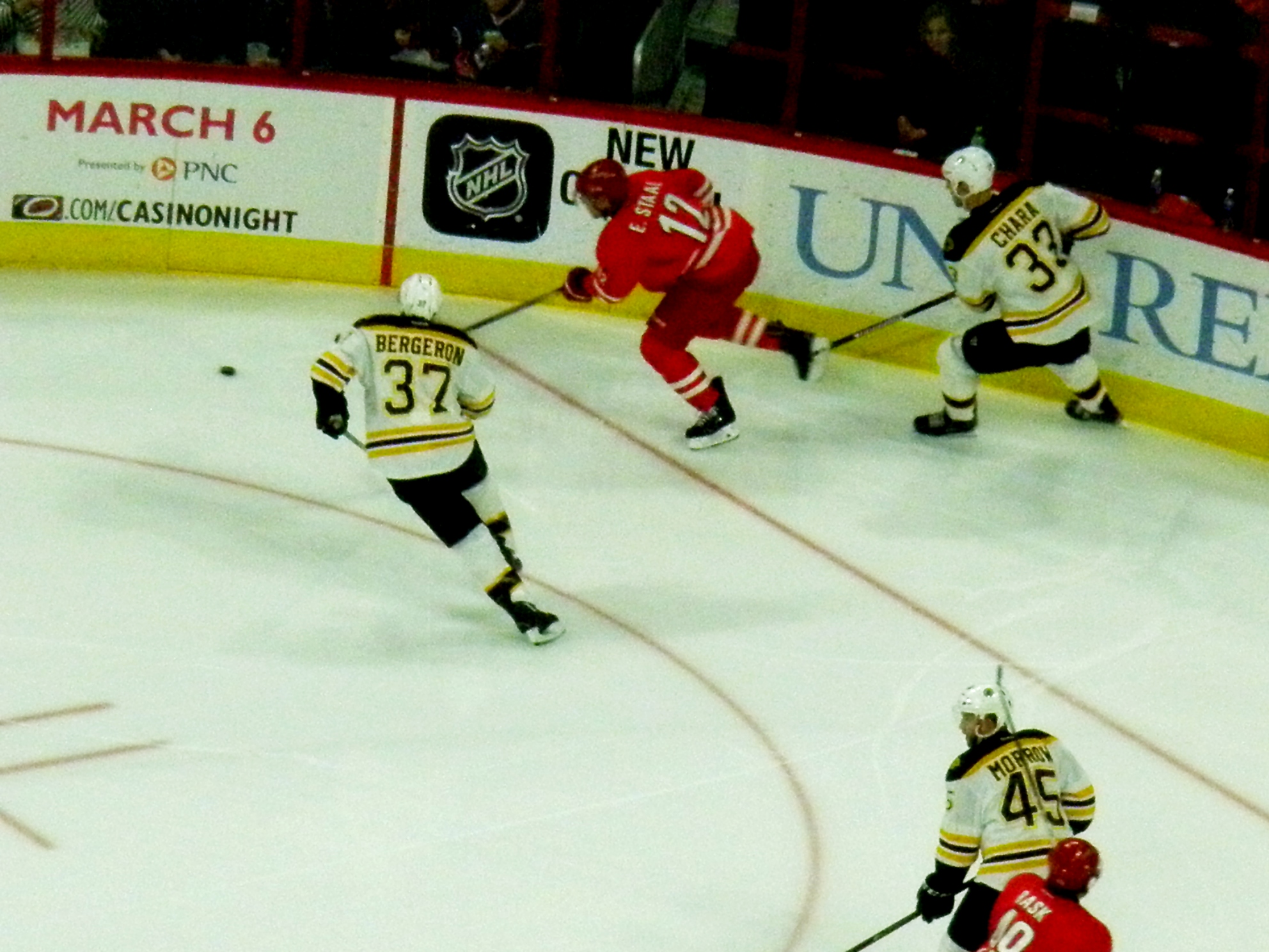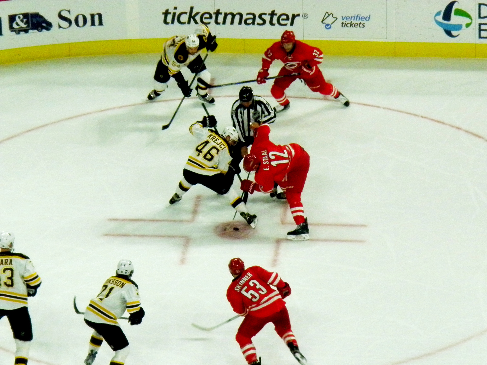 Boston carried its two goal lead into the first intermission with Carolina putting 12 shots on goal to the Bruins’ 11.
