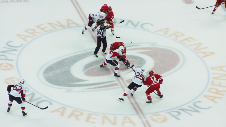 As Carolina struggled to get the puck moving smoothly during its first man-advantage opportunity of the game, the Senators’ Kyle Turris picked up a loose puck in the neutral zone and with Erik Karlsson took off on a 2-on-1 opportunity looking to even the score.