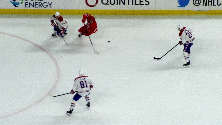 Montreal defenseman Sergei Gonchar beat Jeff Skinner to the puck inside the Hurricanes blue line and dumped the it into the corner where Dale Weise corralled it.