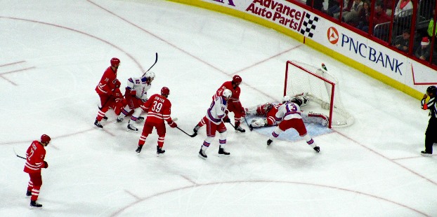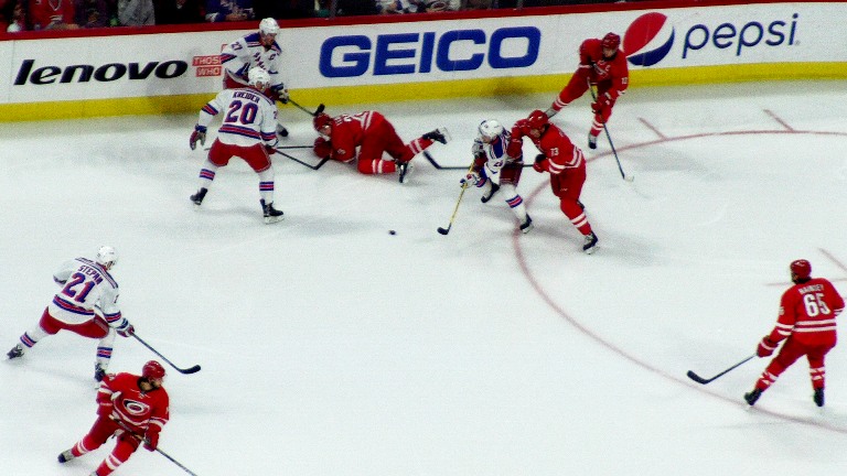 As the Rangers pressed in the Carolina zone, a collision of bodies caught Ward out of position and deep in his net and subsequently he caused his mask to come off while a shot on goal came from the left point.