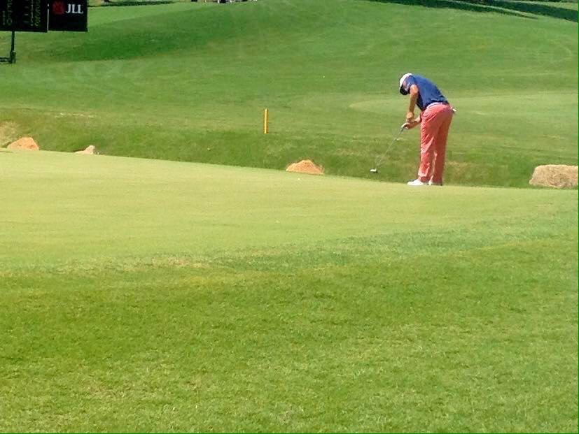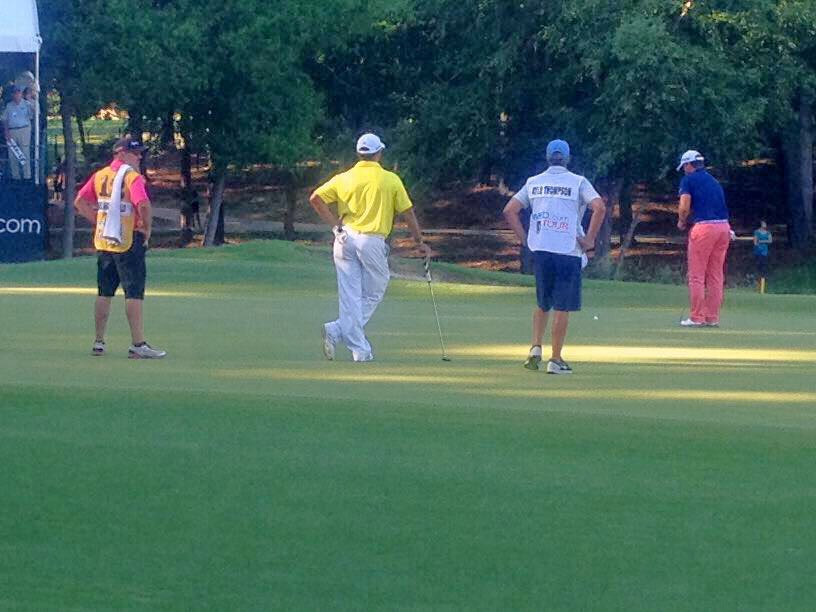 Sitting in second place and trailing the lead by one stroke at -15 when he started the par-5 ninth hole, Thompson laid up and was on the green looking at a long birdie putt down the slope towards the front of the green.