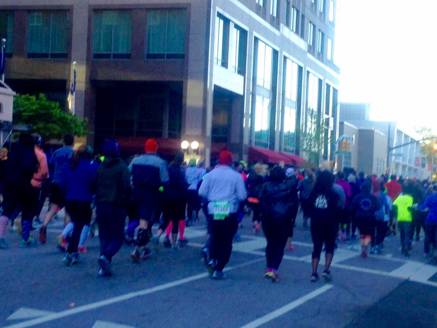 Following Saturday’s inaugural 5K race which was staged at Dorthea Dix Park, half and full marathoners stayed warm inside a number of downtown building doorways and lobbies while awaiting the 7 a.m. start.