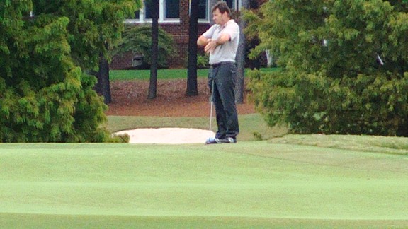 Faldo had just holed out on the par-5 12th hole, but was noticeably massaging and stretching his forearms afterwards while waiting to advance to the next tee box.