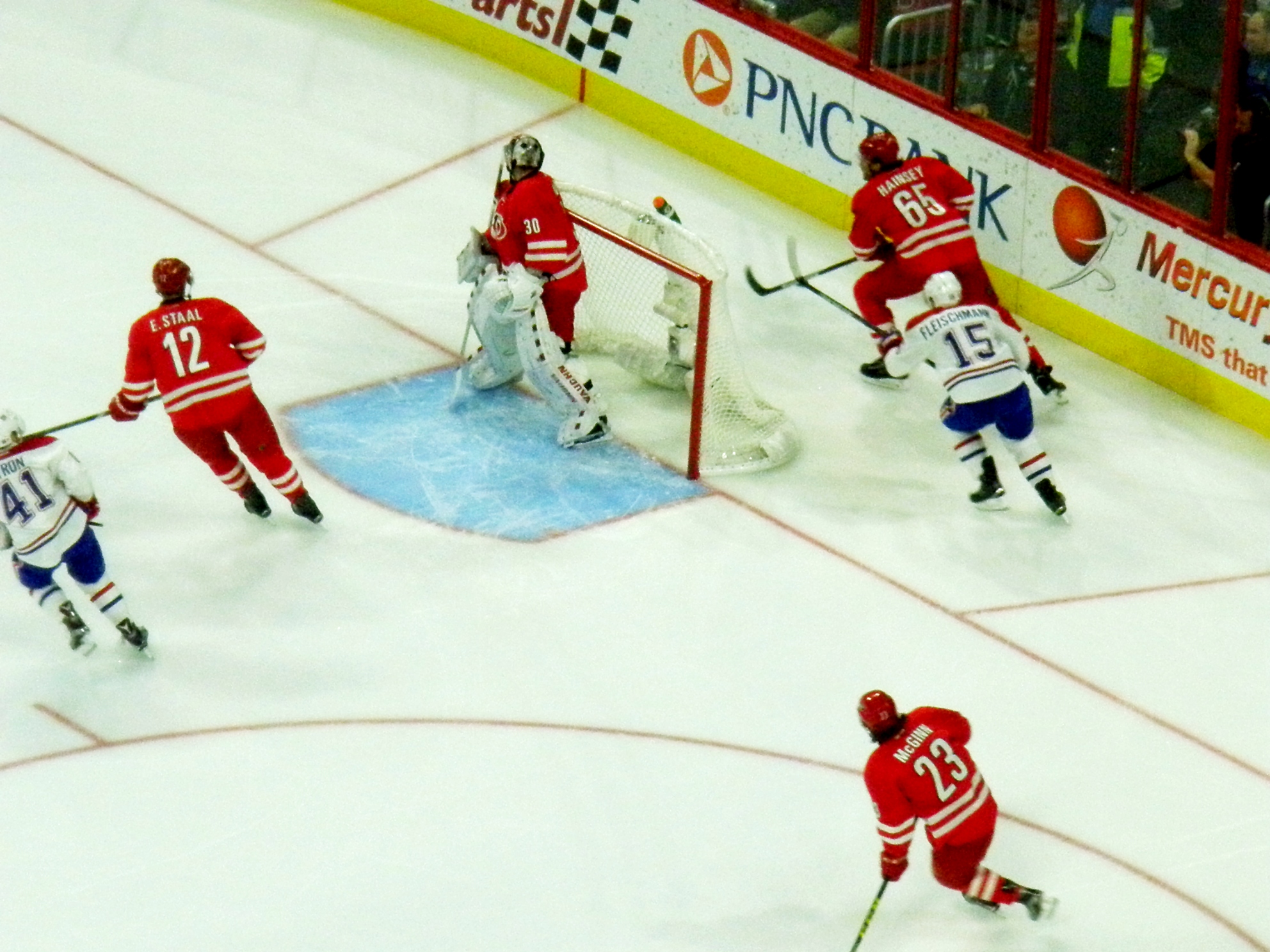 However, the play was challenged by Montreal head coach Michel Therrien and following video review was overruled as goaltender interference, a decision that denied Staal from giving Carolina the lead.